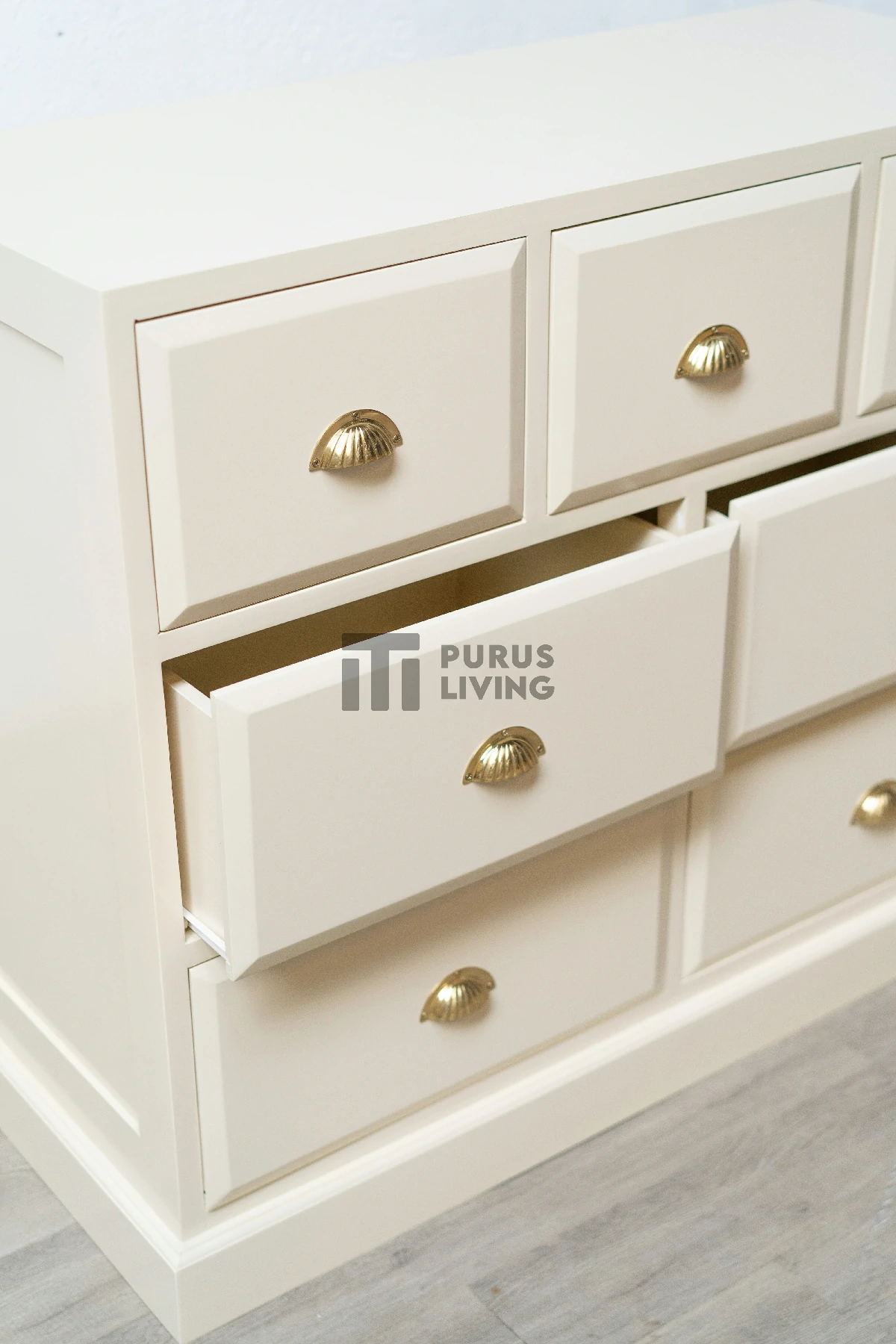 Pertama kami sampaikan bahwa Purus Living melayani custom finishing untuk para konsumen, sehingga konsumen berhak menentukan warna finishing produk yang dikehendaki. Untuk produk ini kami menggunakan finishing White Duco. Finishing Duco sangat cocok bila dipadankan dengan produk-produk yang terbuat dari kayu jati solid (Teak Wood). Karena dapat memberikan kesan yang elegan dan mewah.