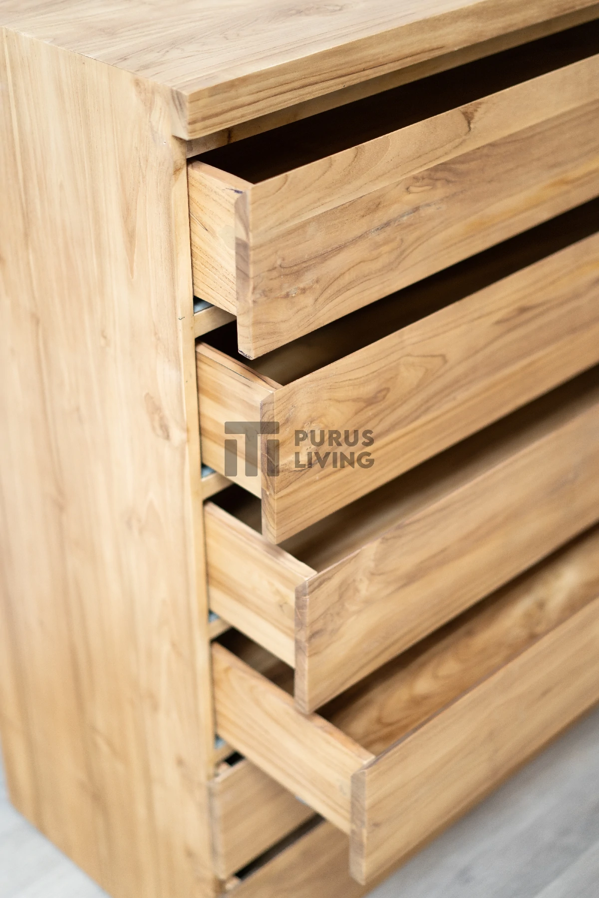Dengan desain yang modern dan elegan, bufet ini memiliki nilai estetika tersendiri, kemudian dengan menggunakan bahan baku berupa full kayu solid membuat drawer ini memiliki daya tarik tambahan dan tentunya memiliki kekuatan yang tidak diragukan lagi, dengan kata lain furniture memiliki kualitas yang sangat baik. Tentunya bufet ini dapat bertahan dalam waktu yang lama.