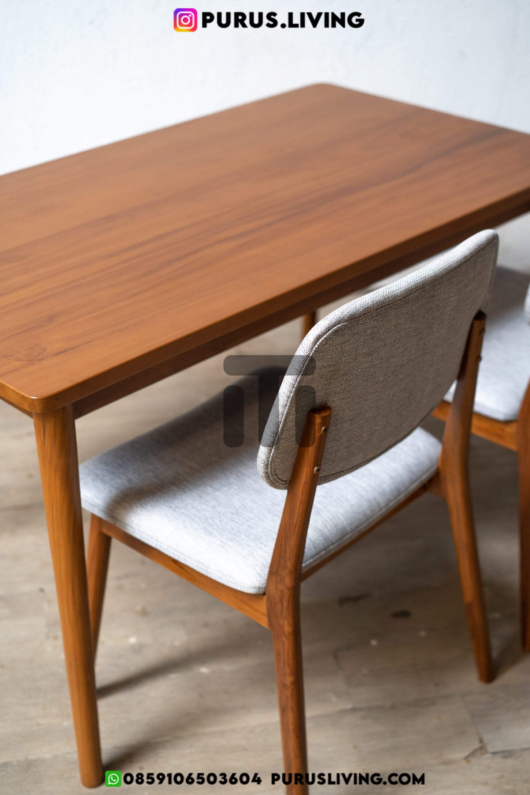 Dining set minimalis ini menggunakan bahan baku Kayu Jati solid (Teak Wood) dan ditambah dengan konstruksi/purus. Produk-produk dari Purus Living dekerjakan oleh para profesional dibidang furniture dari Jepara. Dikerjakan dengan teliti dan cermat sehingga furniture ini menjadi produk yang kokoh, kuat dan memiliki fungsi guna.