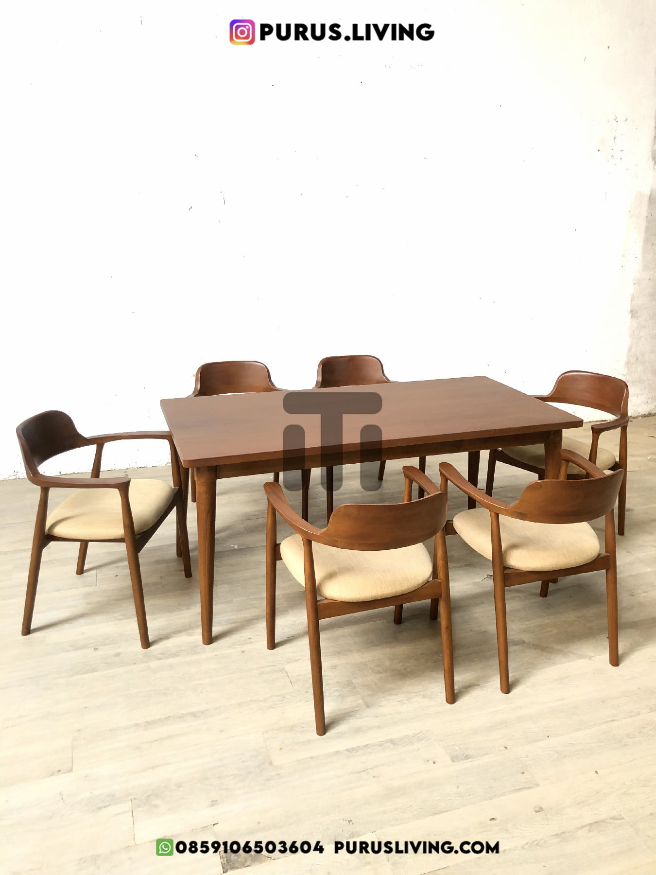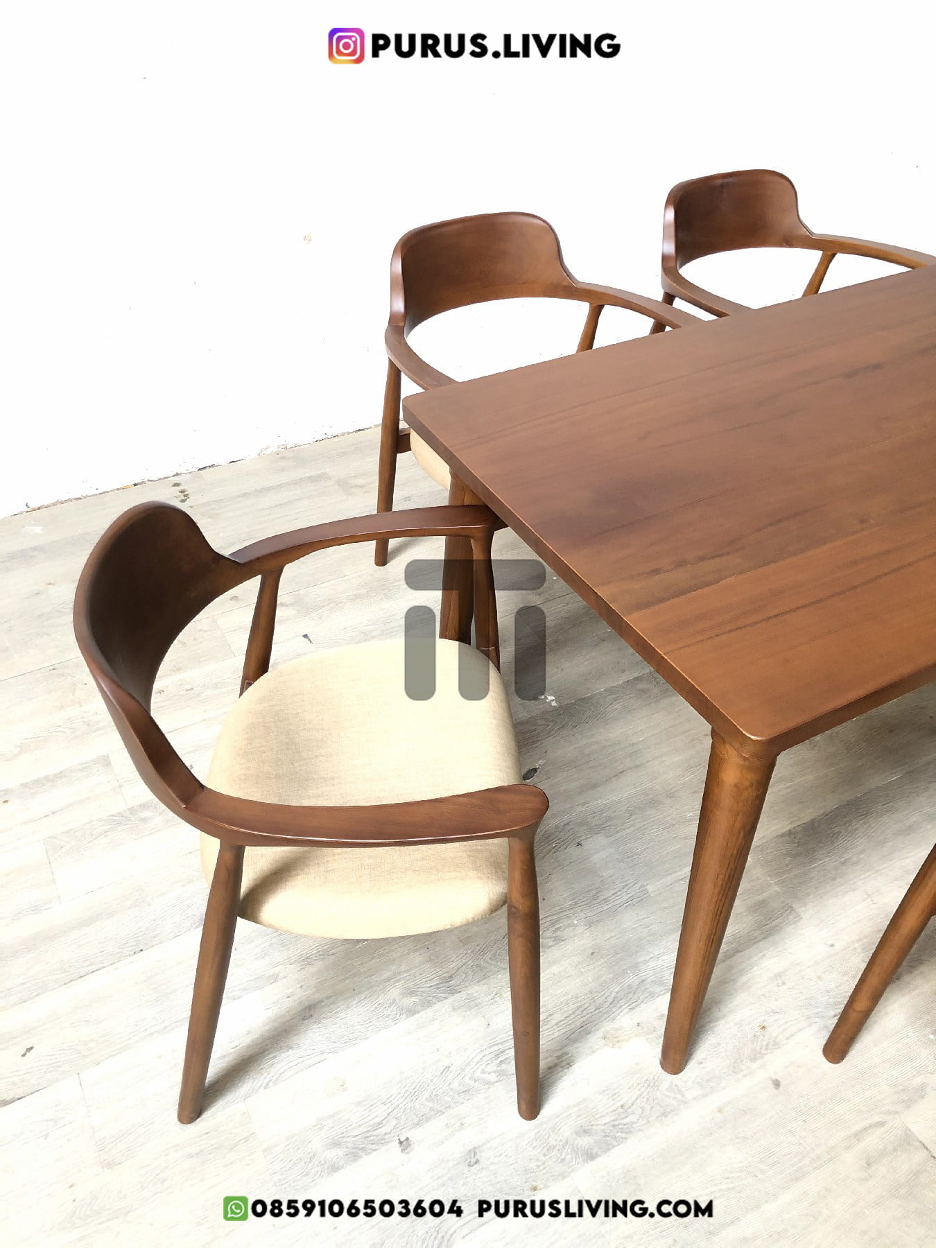 Pertama kami sampaikan bahwa Purus Living melayani custom finishing untuk para konsumen, sehingga konsumen berhak menentukan warna finishing produk yang dikehendaki. Untuk produk ini kami menggunakan finishing Natural Walnut. Finishing natural sangat cocok bila dipadankan dengan produk-produk yang terbuat dari kayu jati solid (Teak Wood), Karena tidak menghilangkan urat dan motif alami kayu.