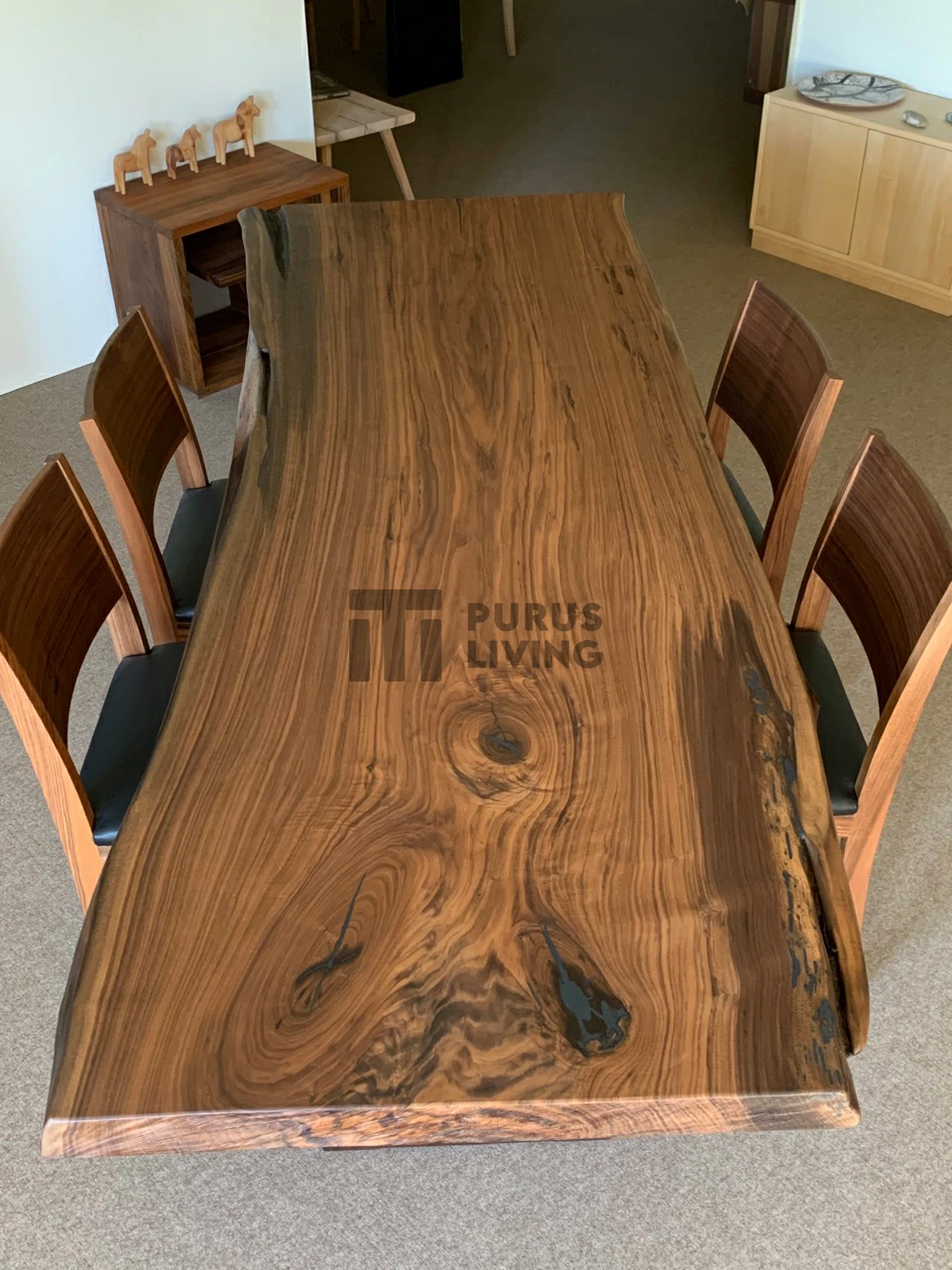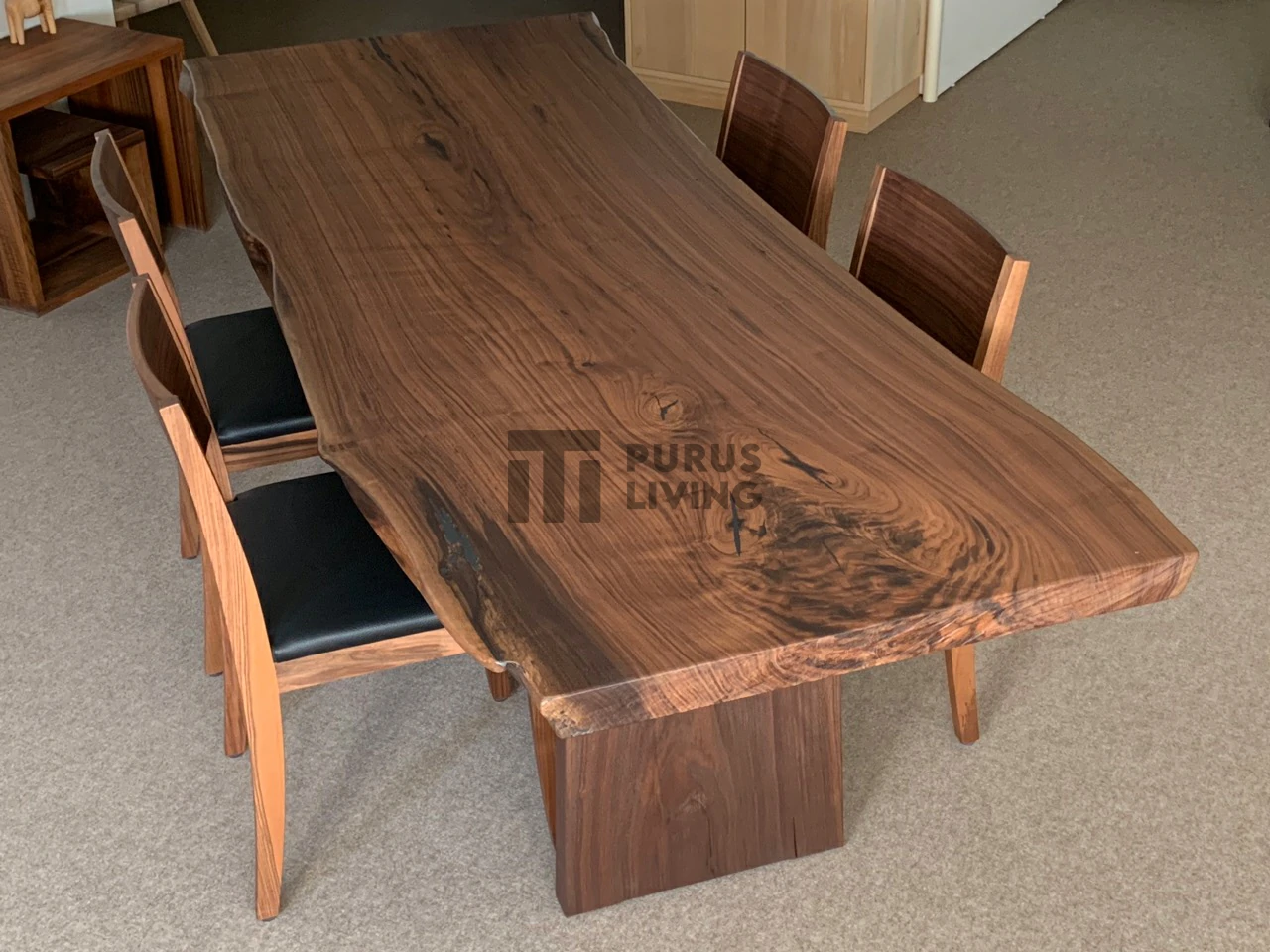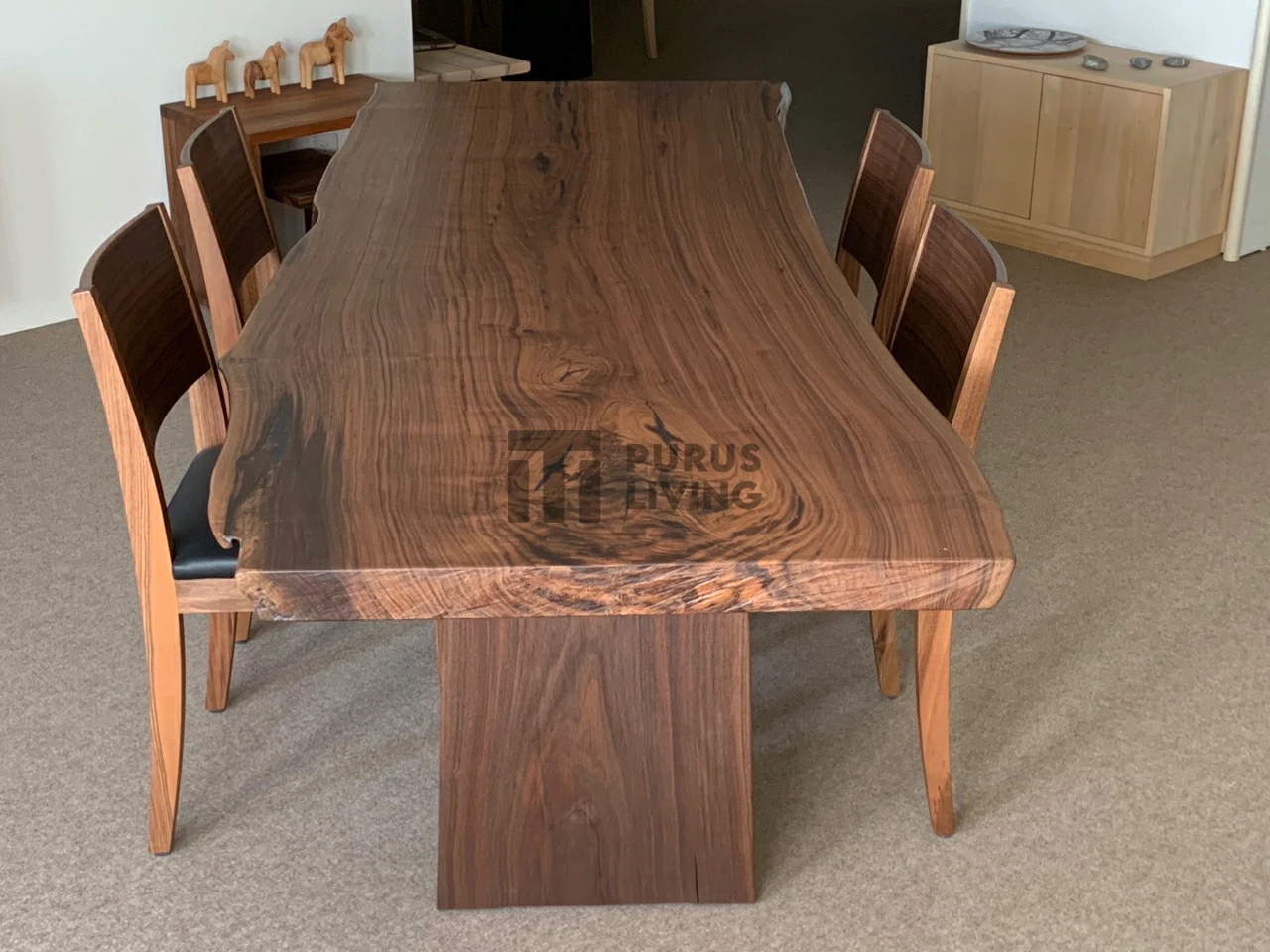 Pertama kami sampaikan bahwa Purus Living melayani custom finishing untuk para konsumen, sehingga konsumen berhak menentukan warna finishing produk yang dikehendaki. Untuk produk ini kami menggunakan finishing Natural Dark Brown. Finishing natural sangat cocok bila dipadankan dengan produk-produk yang terbuat dari kayu trembesi solid (Suar Wood), Karena dapat memberikan kesan yang elegan dan mewah serta tiidak menghilangkan aksen natural kayu.