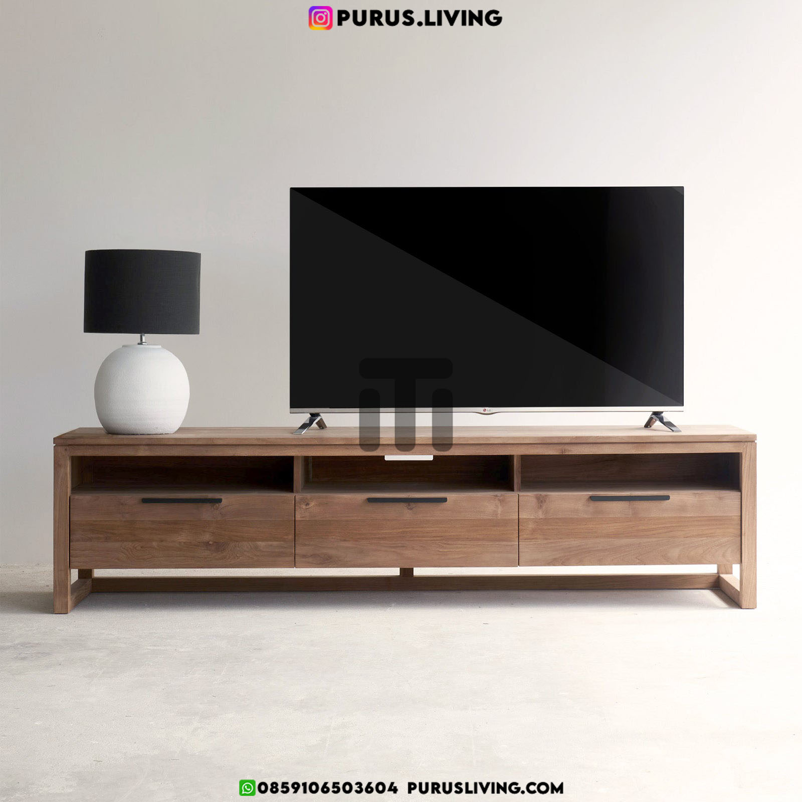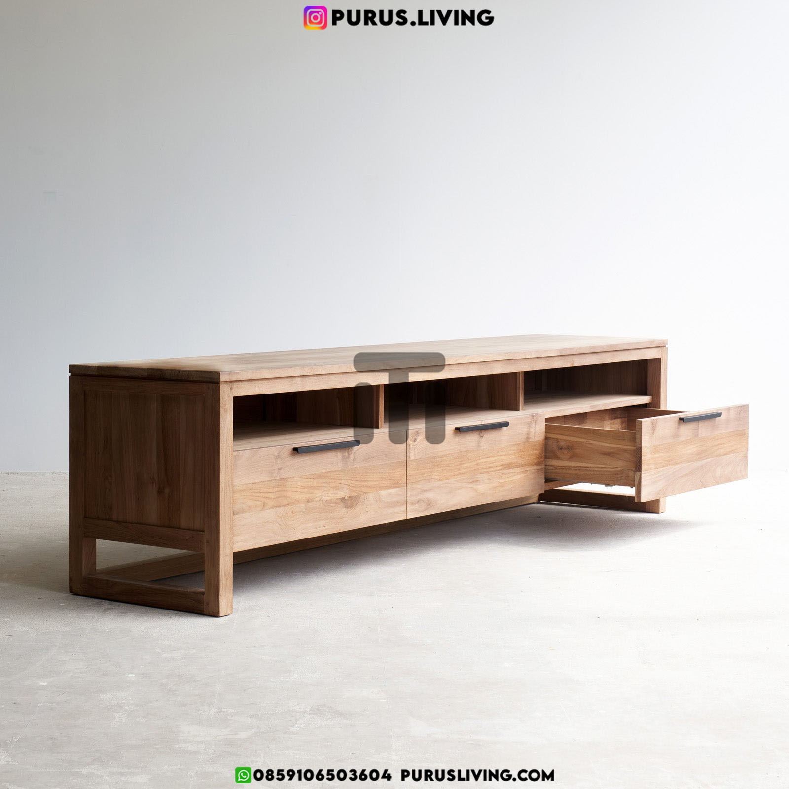 Meja TV Minimalis ini menggunakan bahan baku Kayu Jati solid (Teak Wood). Dan ditambah dengan konstruksi/purus. Produk-produk dari Purus Living dekerjakan oleh para profesional dibidang furniture dari Jepara. Dikerjakan dengan teliti dan cermat sehingga furniture ini menjadi produk yang kokoh, kuat dan memiliki fungsi guna.