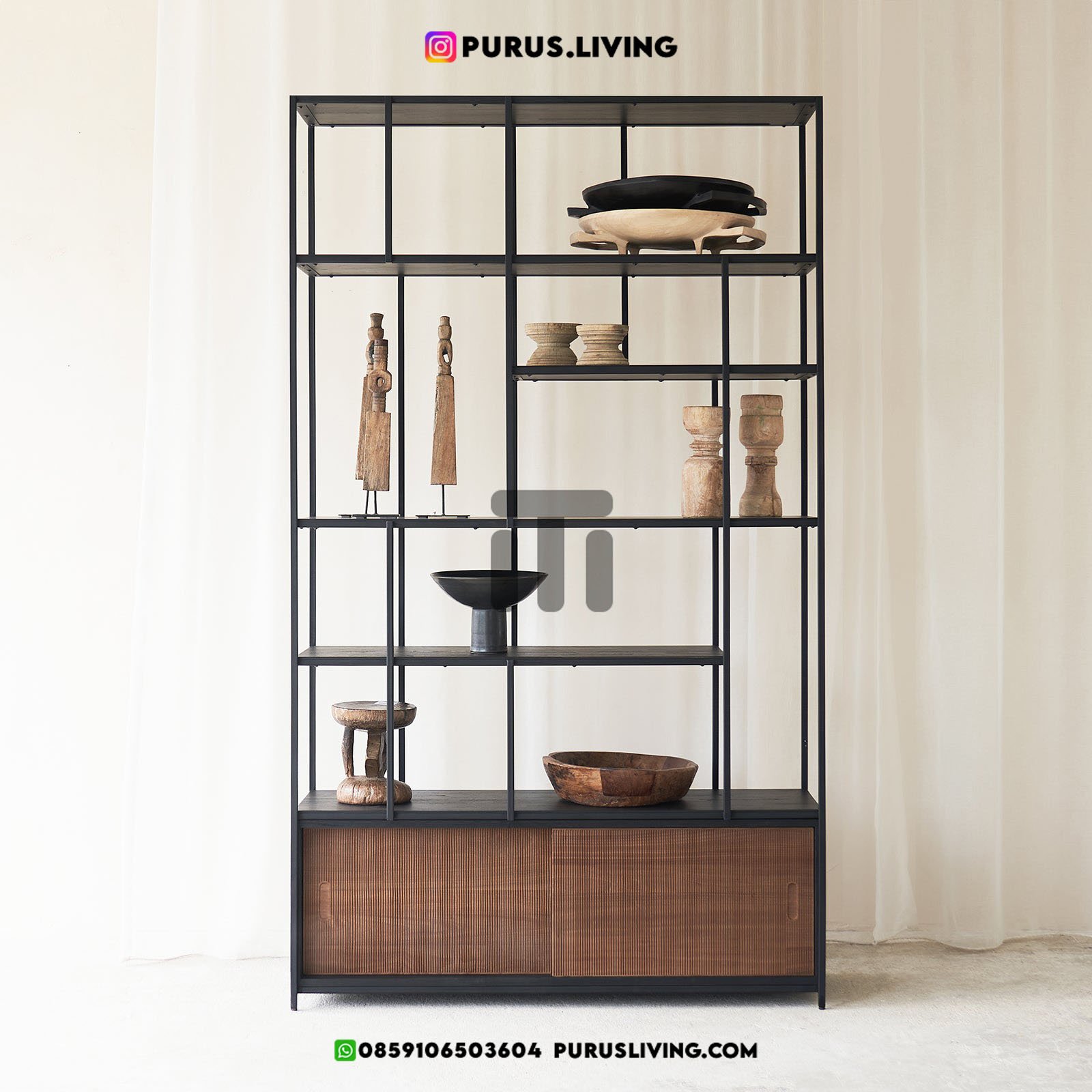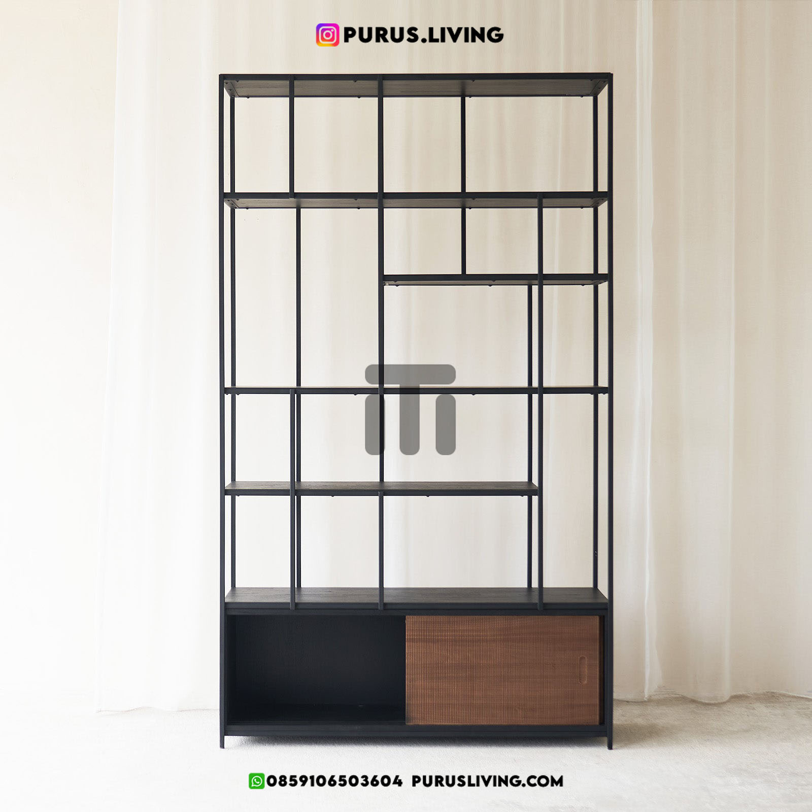 Rak buku kayu dinding ini menggunakan bahan baku Kayu Jati solid (Teak Wood) dan rangka besi yang kokoh ditambah dengan konstruksi/purus. Produk-produk dari Purus Living dekerjakan oleh para profesional dibidang furniture dari Jepara. Dikerjakan dengan teliti dan cermat sehingga furniture ini menjadi produk yang kokoh, kuat dan memiliki fungsi guna.