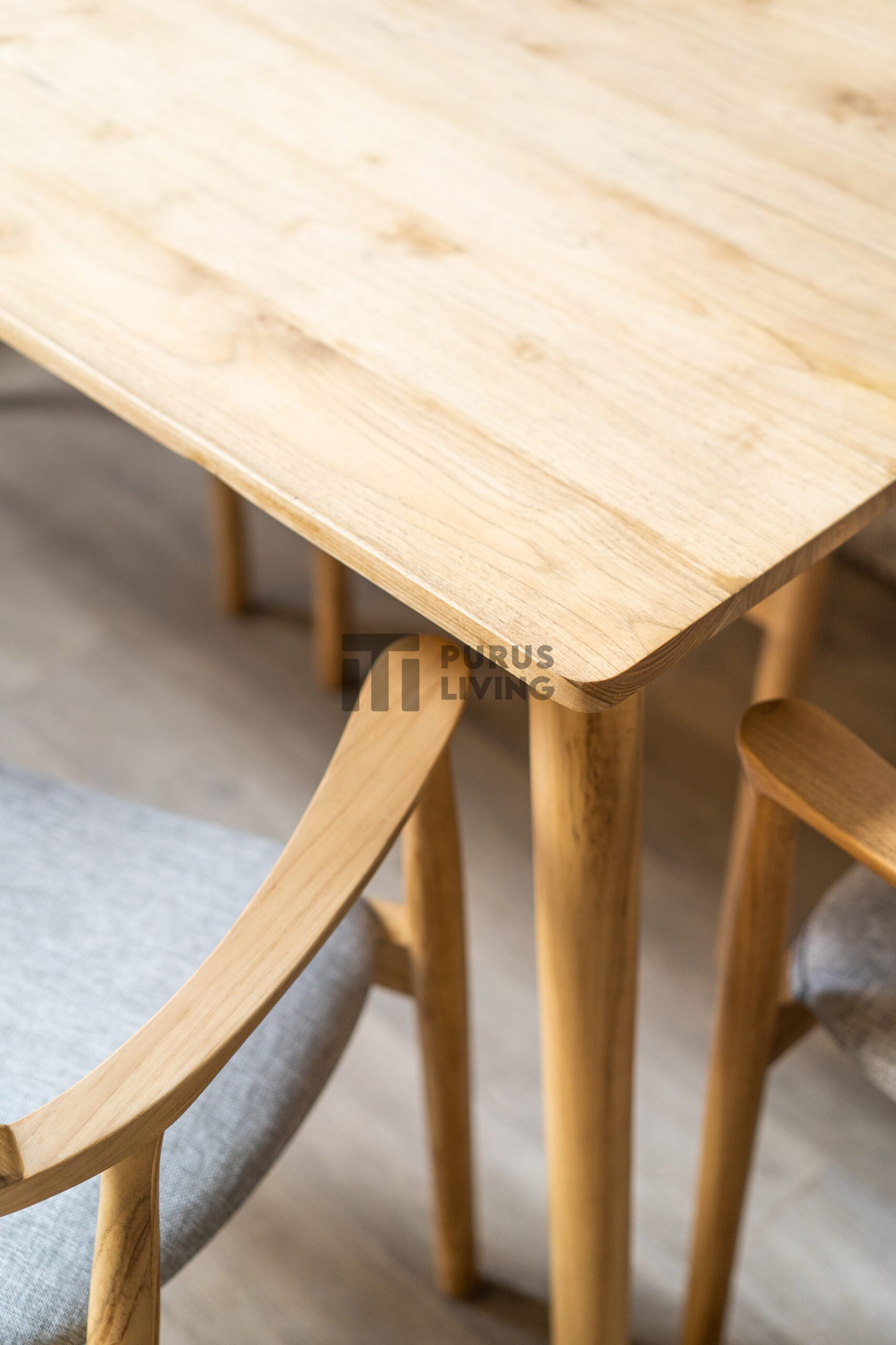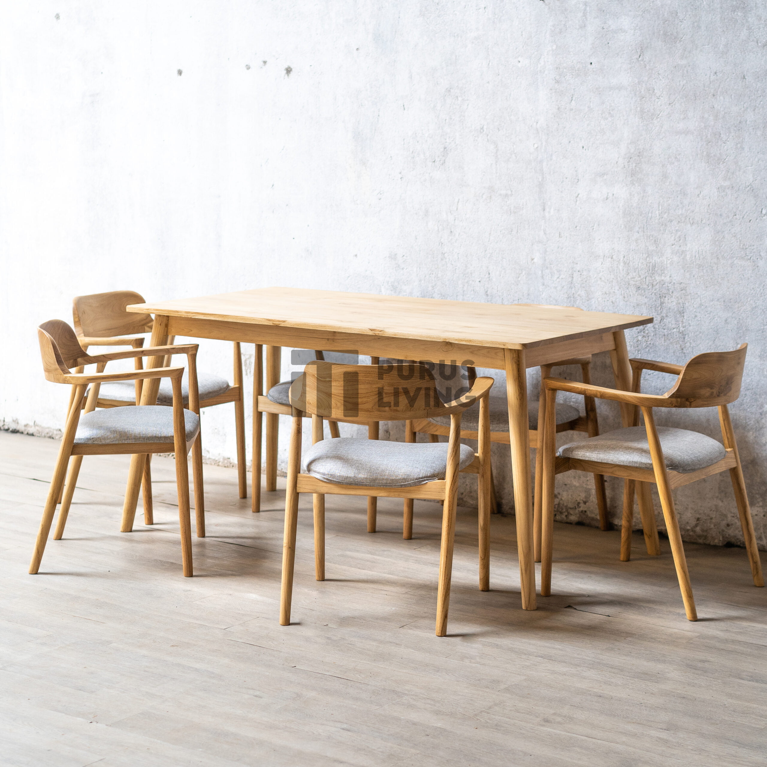 Set meja makan minimalis kayu jati ini menggunakan bahan baku Kayu Jati solid (Teak Wood) dan ditambah dengan konstruksi/purus. Produk-produk dari Purus Living dekerjakan oleh para profesional dibidang furniture dari Jepara. Dikerjakan dengan teliti dan cermat sehingga furniture ini menjadi produk yang kokoh, kuat dan memiliki fungsi guna.